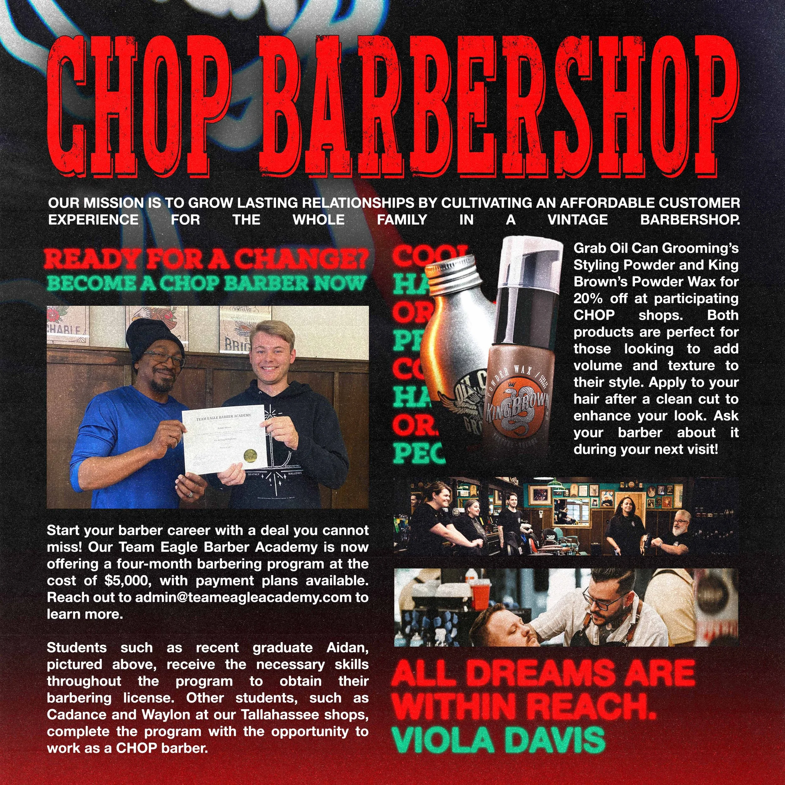 CHOP Barbershop is a southeastern hair chain focused on providing customers with cool hair and a healthy environment for their barbers.