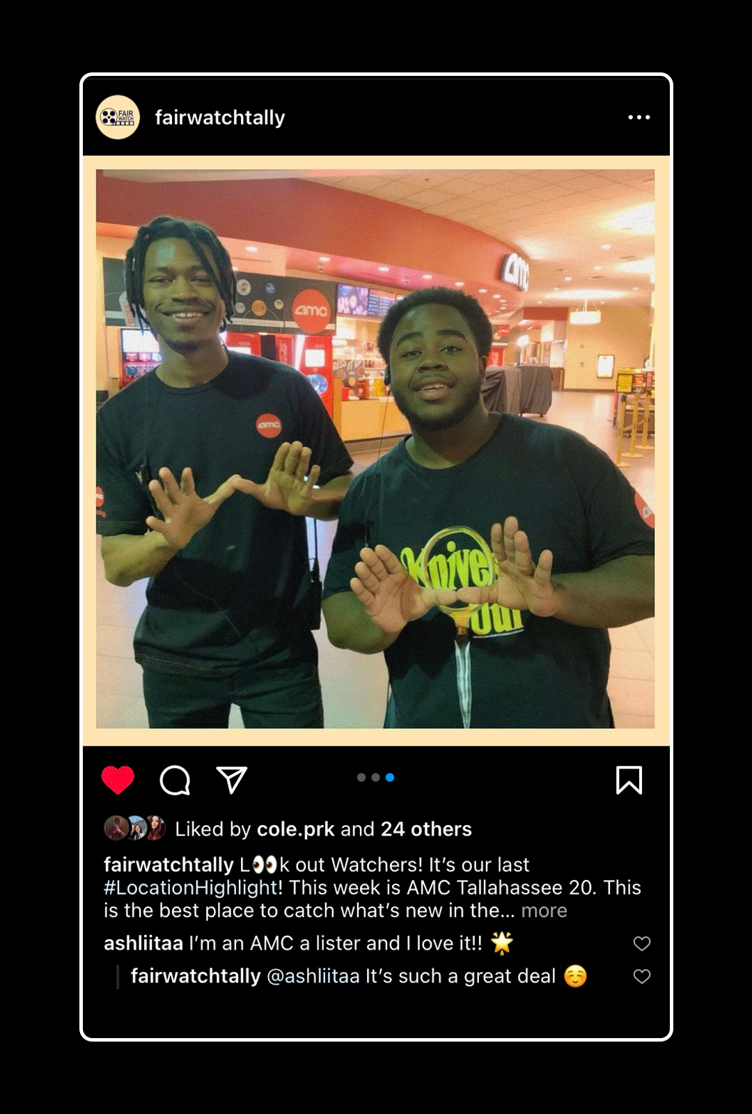 We shouted out local theaters with posts focused on what made each location special, such as memberships, free events and unique film selections. This was paired with a staff member or visitor to personalize the location. Three locations recognized us by commenting and sharing, which boosted our reach and helped it become our most liked post series.